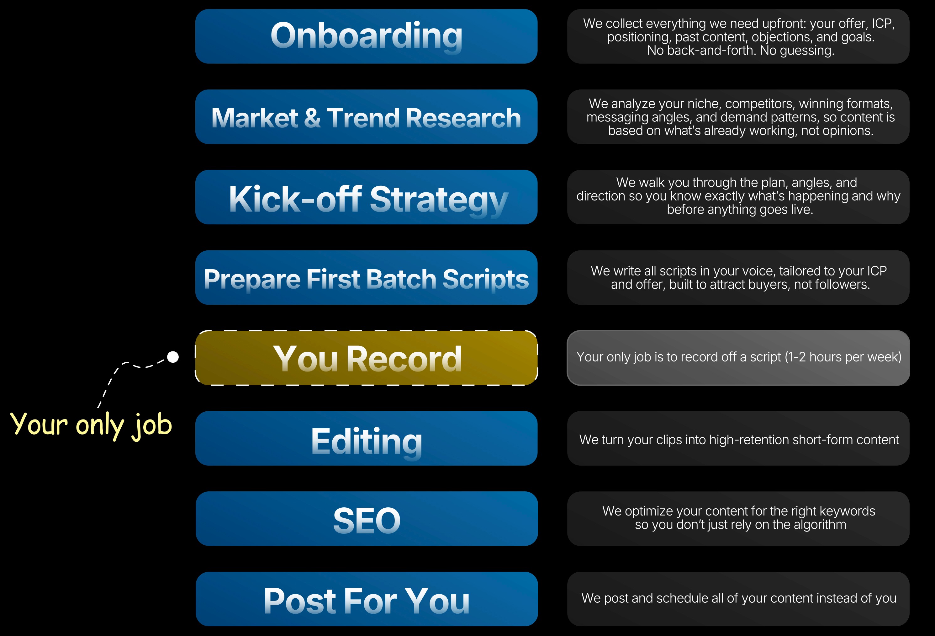 Editors make content look good. We build a system that sells. This includes strategy, research, scripting, positioning, editing, packaging, and distribution — all tied directly to your offer.